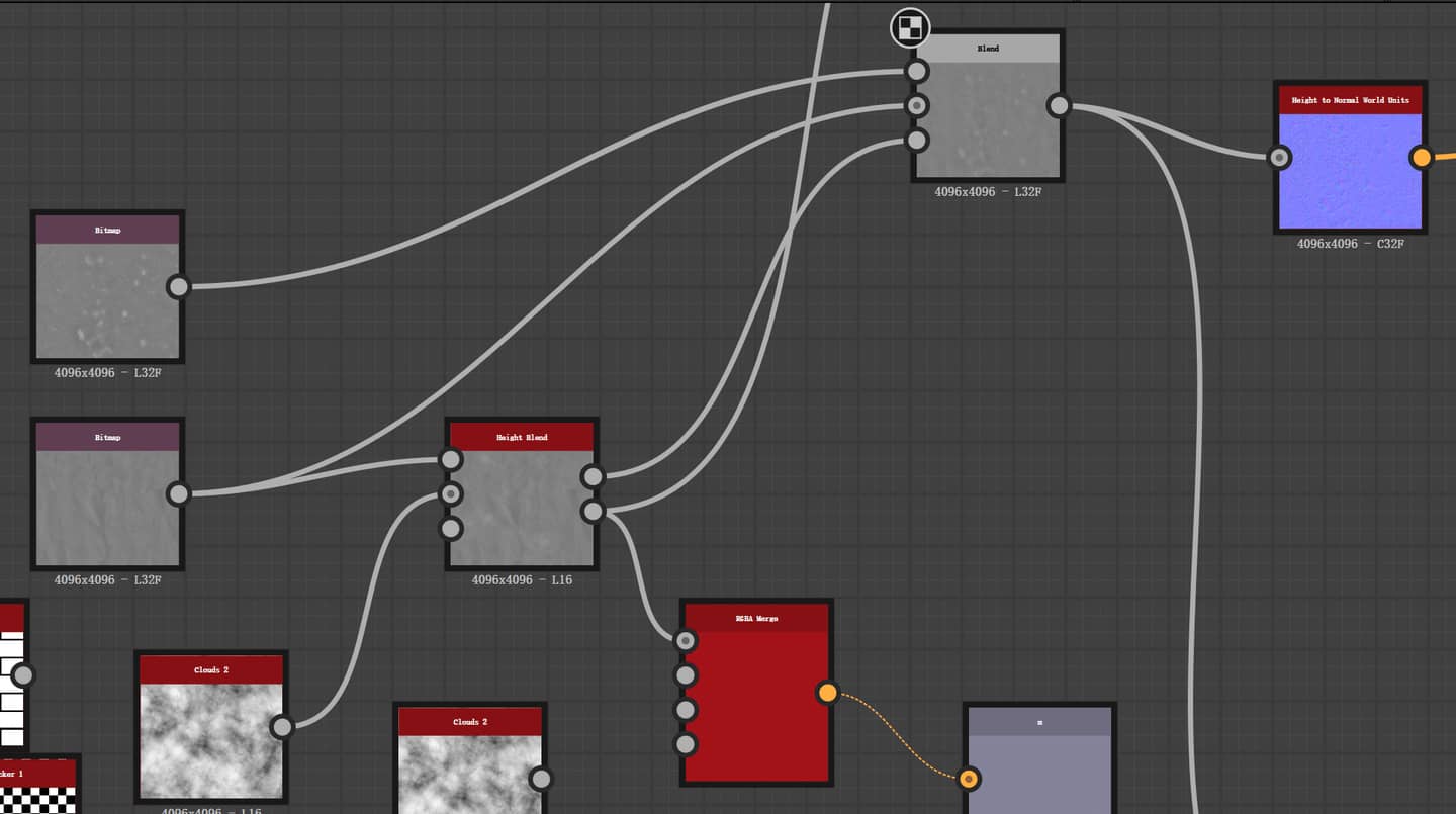 然后是材质混合,blend节点可以通过opacity来控制上下两个输入的混合比例,白色为全都是输入1黑色为全都是输入2,这里使用了height blend,直接用cloud作为opacity也可以控制混合,但是貌似黑的部分起不来所以基本都是输出输入1,而height blend根据简易教学说其height offset控制输入1和输入2的混合比例,我的测试中目前没有验证这一点,找不到规律,似乎仅仅是无序的、强对比度的,0时为全黑、1时为全白,抛开这一点通过这个height blend连接output输出一个tgar纹理作为mask。