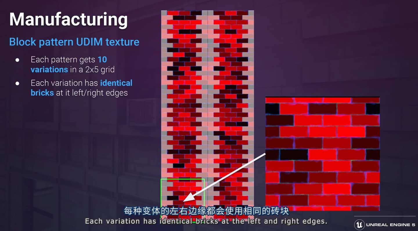 每个图案有10个变种把它放在2x5的格子里。每个砖边缘都用相同的砖块使他们之间的衔接是无缝、和谐的。进一步,作者把5个图案各自的10个变种一起放到udim里。