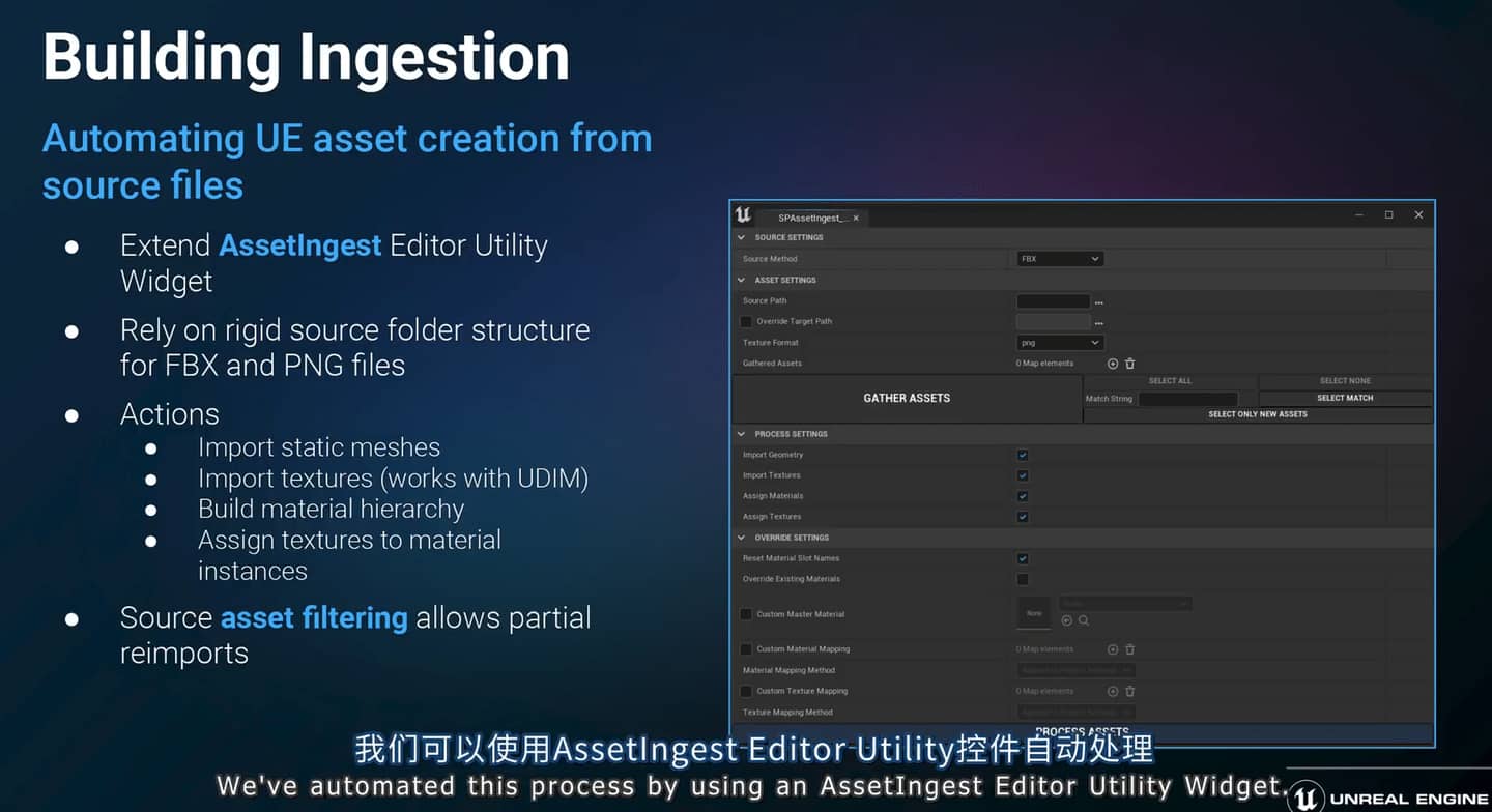 材质都完成以后如何导入到ue,并分派给整个城市的建筑模块呢?这里使用了assetingest editor utility控件自动处理。