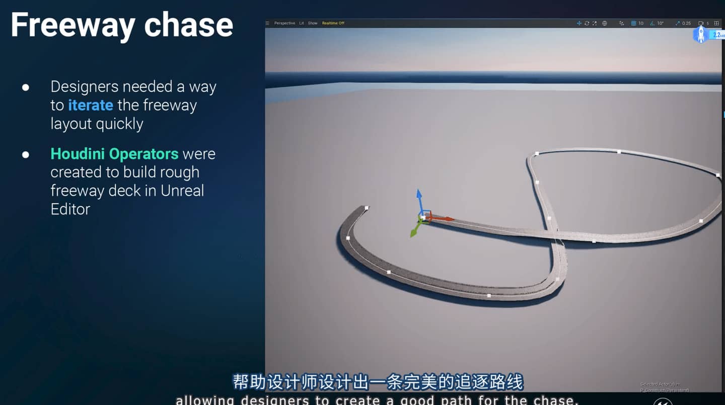 高速包括55个入口,在unreal中用spline可以快速制作高速路,这个估计和joe garth的示范是差不多的,由蓝图程序驱动spline对一个road mesh做控制生成。