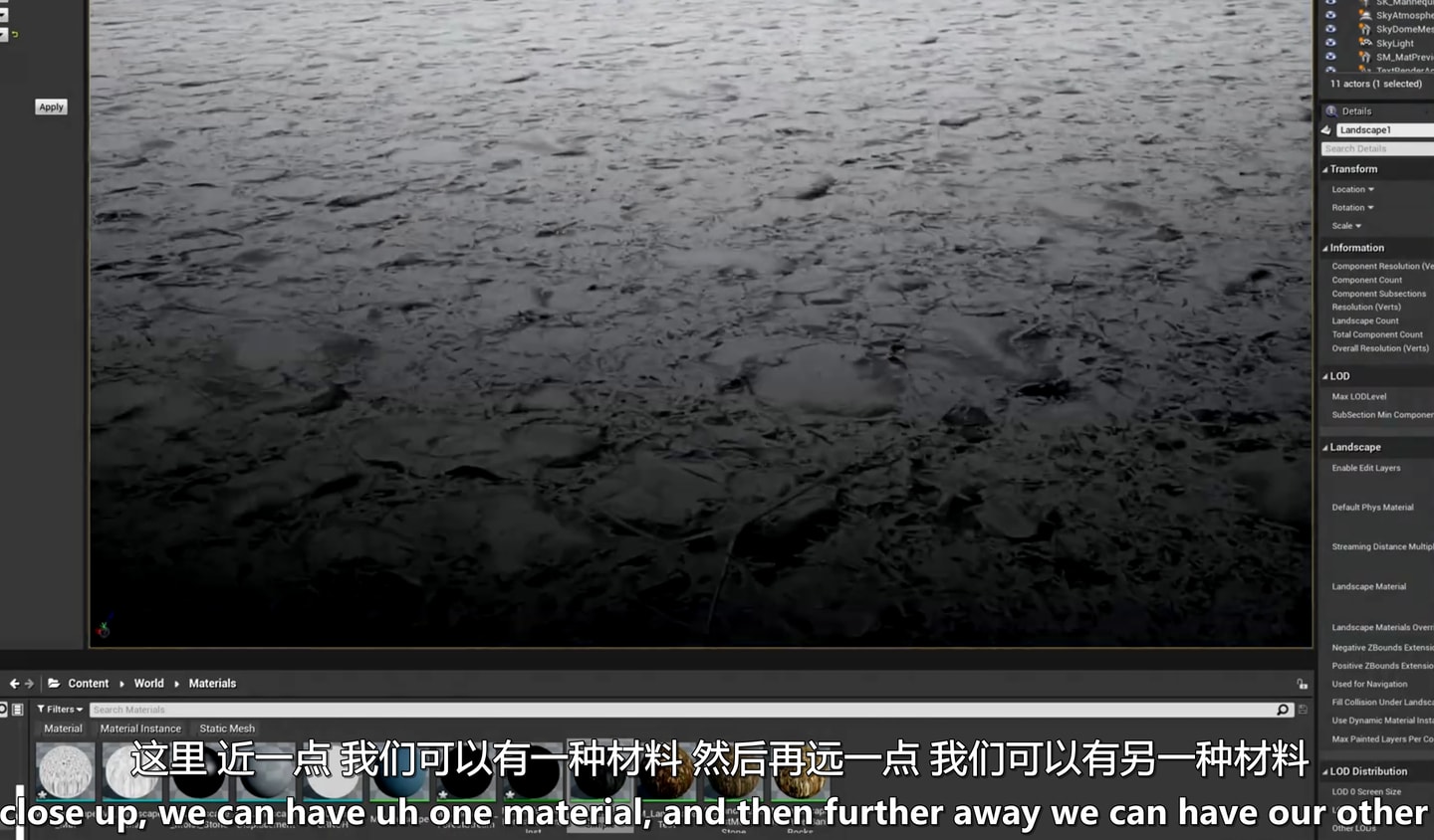 作者建议从小的landscape做起,然后再做大的。创建完地形后为了使地形的变化、材质更能展现细节,需要进一步增加像素,这里要考虑到加载的问题,较远的地方自动降低像素,进的地方展示最大像素,调整LOD distribution即可。放置一个工程自带的人体作为尺寸参考。