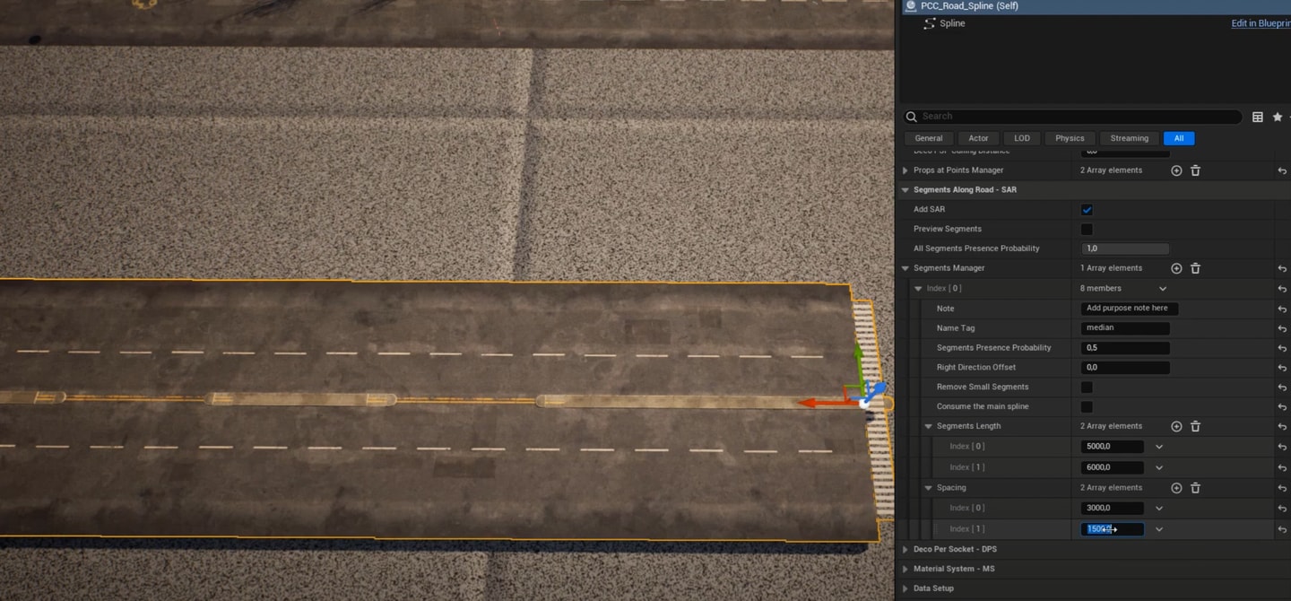 pcc道路模块添加median中间路肩,也是用mesh along spline但它可以配合segment along road中的segment长度设定以及segment 之间的spacing使median有间距。PRG中似乎没有这样的功能,要在PRG中实现类似效果需要使用props system,规则间距spacing,不规则随机间距变化用min max transform。