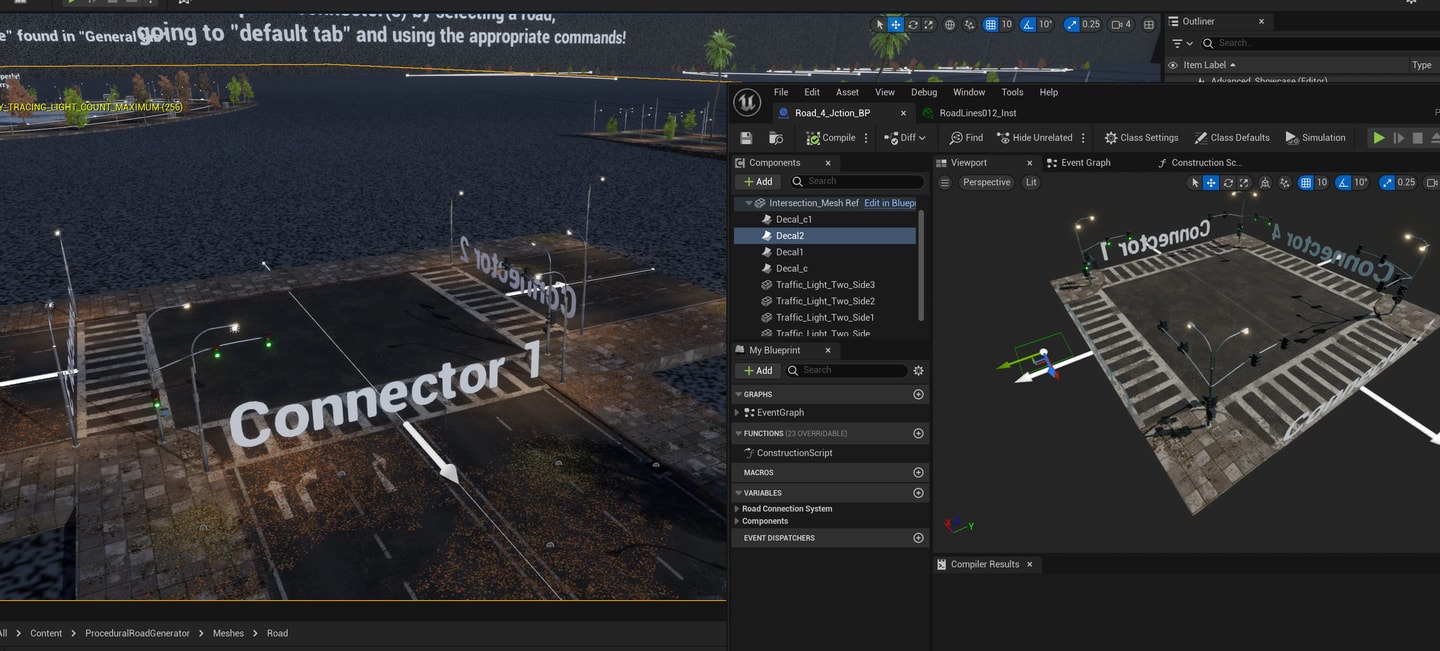 关于路口处的转向标可以在intersection中用decal解决,注意intersection是一个blueprint,没法像road那样替换mesh,另外示范里多次提到道路系统中最好添加mesh而不是blueprint,blueprint不能实例化会占用许多资源,目前在showcase中移动道路blueprint巨卡无比,经测试发现关闭props system和deco per socket system后移动道路blueprint就不卡了。图2、3是对blueprint做了些许修改后得到的4岔路口效果。