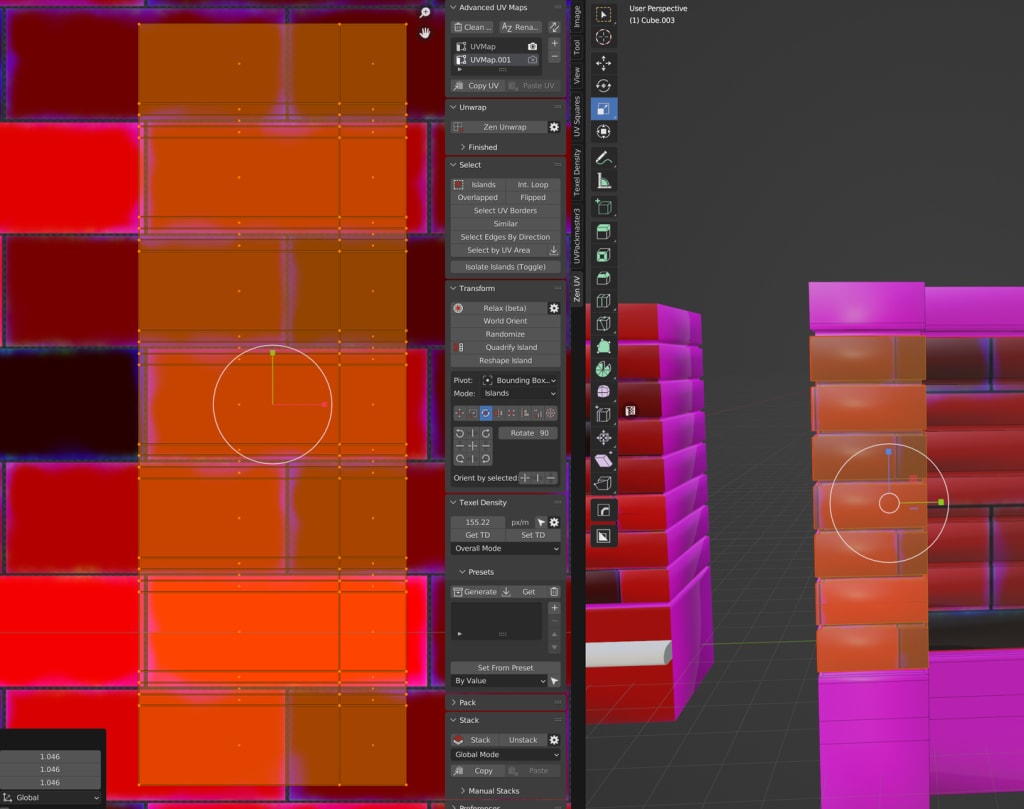 我自己仿照这个部件建模后,L选择关联面zen unwrap可以看到插件对关联面的边界mark seam,对于这些规整的几何面quadrify island工具没有问题,对两组关联面zen unwrap之后可以顺利将它们拼接起来,这样的话uv打直、拼接解决了,问题是如何对这些块面排布呢?