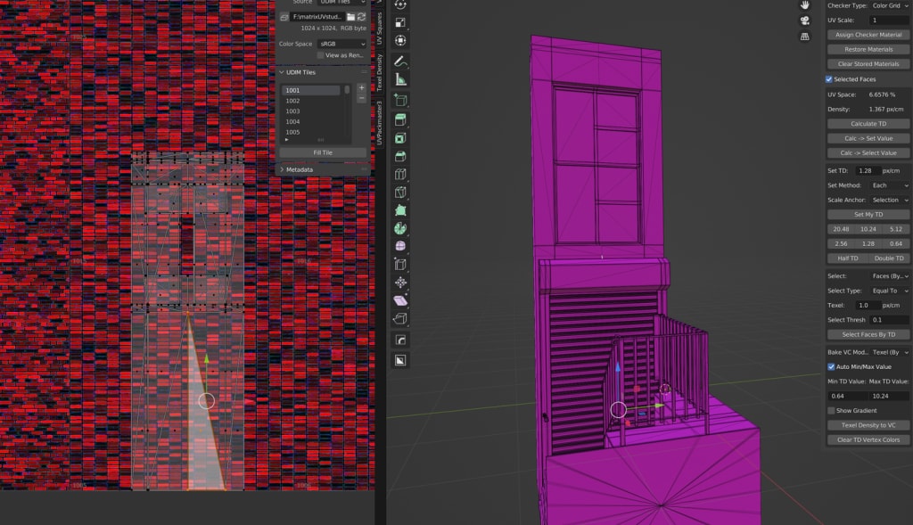 第二套uv也就是涉及block、brick在udim的排布。可以看出来在udim里的排布与最终渲染的砖块大小、排列有关联,这里的所有材质纹素有较大的差异,比如砖块是1.362cm/px,而门厅的那一块只有0.064,金属门是0.128.