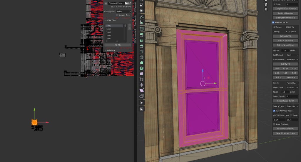 这里要补充说明一下之前计算的texel density都是按照512大小的纹理来的,如果是4096,那么就x8.下面这个模型两侧立柱为0.6,拱顶窗楣是0.24,拱顶下面的立柱是1.2,shift+g可以看到这些block的材质相同,但是texel density大小差异很大,这里应该是手动选取区块缩放、移动的。一会儿尝试复现这些构成。