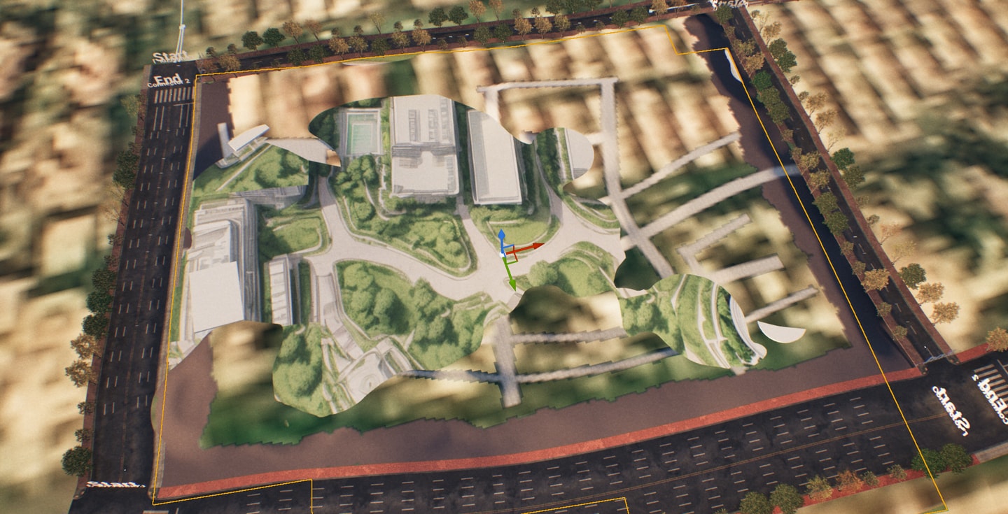 通过矩形curve精确绘制出街区的范围,knife project投射出这个区域,到ue中调入这个街区比对无误之后ai生成街区的平面参考,再具体规划建筑位置、小区道路。