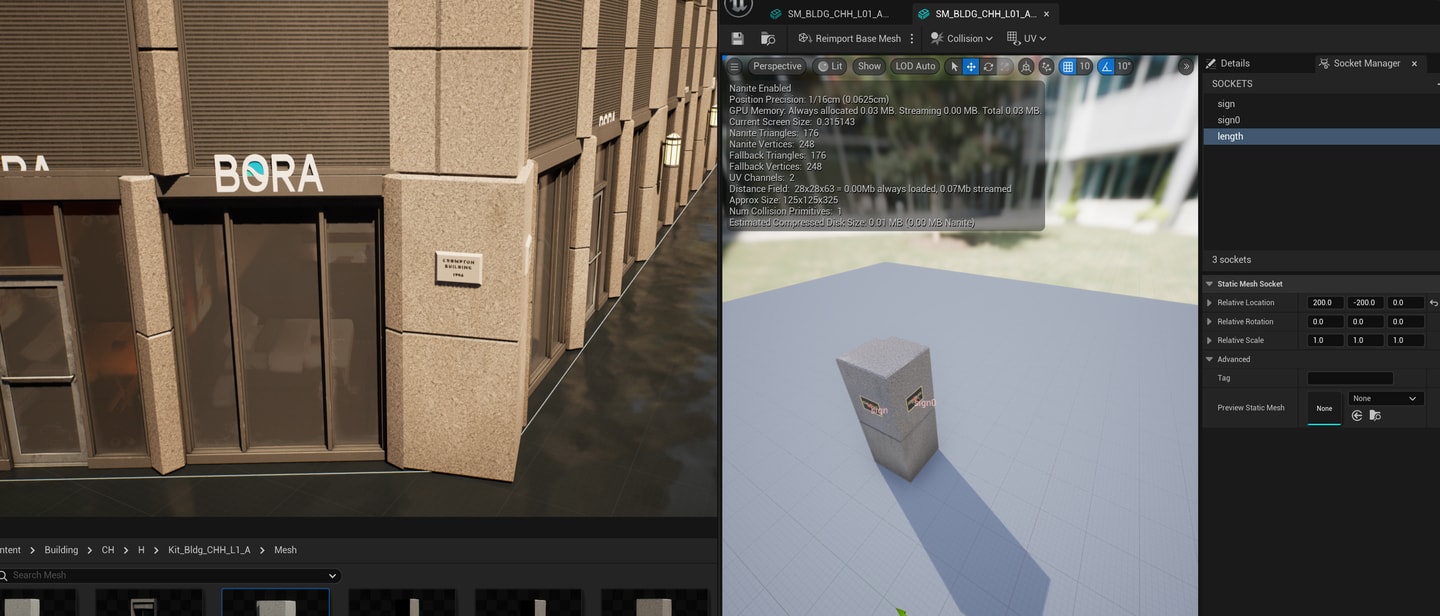 目前来看导入的模型要是朝右前方显示才能在PBG中正常使用,具体配合导入时的旋转设置。一些部件有附件、装饰超出主体的边界需要用socket length修正,目前看来是物体本身的blender边界尺寸减去超出的部分,在ue的socket length中填入y值。
