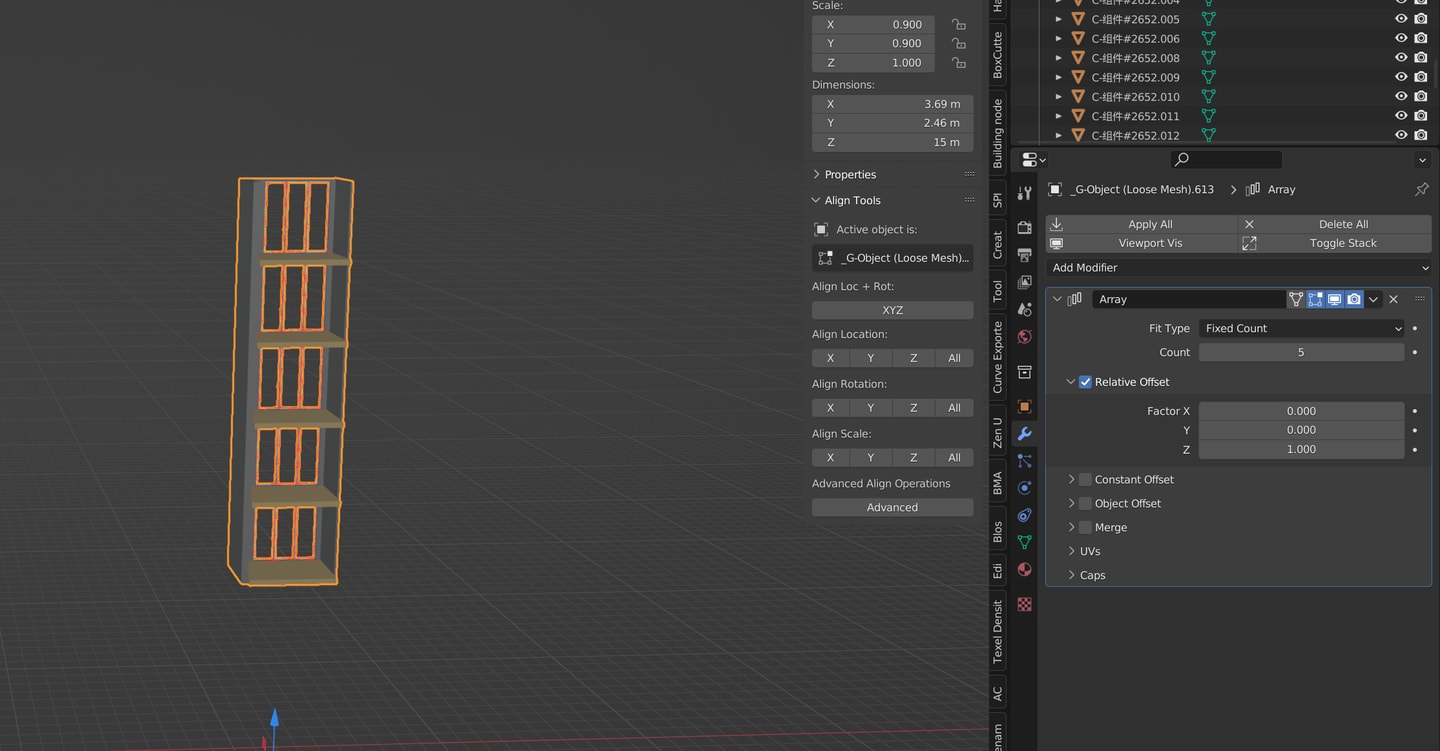 进一步来说完全可以用array去排布上下层重复的部件而不是手动复制instance,反正这些东西要合并成房型的到时候也无关instance,且array状态下等于有关联。等需要合并房型时apply array,edit 模式全选seperate by loose part,由于都是同个floor上涉及合并因此框选也不会有太大麻烦。回看之前多个项目涉及部件重复利用时也可以套用array节省大量时间。