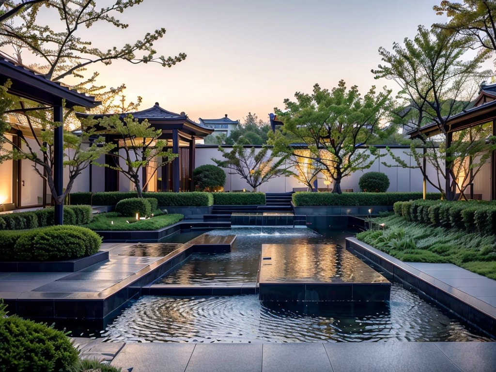 an elegant and noble chinese courtyard,outdoors,sunset,with water features,lawn,hard paving,Falling water,corridor,rockery,lamp,pavilion,benefiting each other at dusk,showcasing luxury to the fullest,lora:现代中式园林景观_中式园林景观SD1.5:0.3,<lora:ASTRA_Resident_Regular_V1 常规住宅:1>,