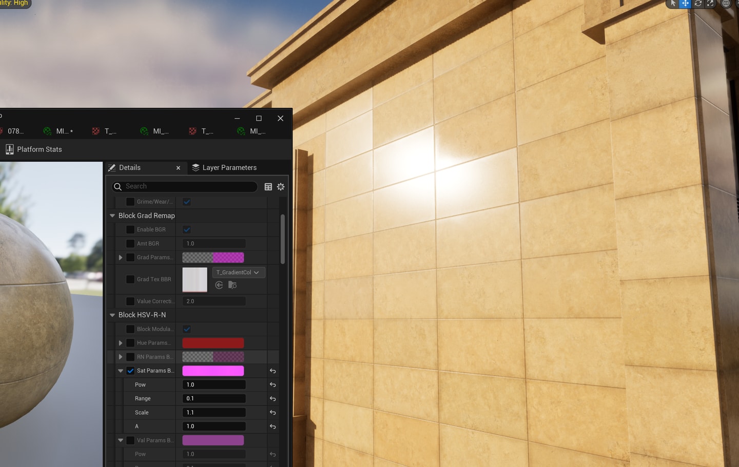 大理石的光滑质感需要对aormd和normal修改贴图,改成granite这套。matrix block材质初始状态的block颜色变化范围太大了,在Block HSV-R-N下面的Sat刁姐range即可。