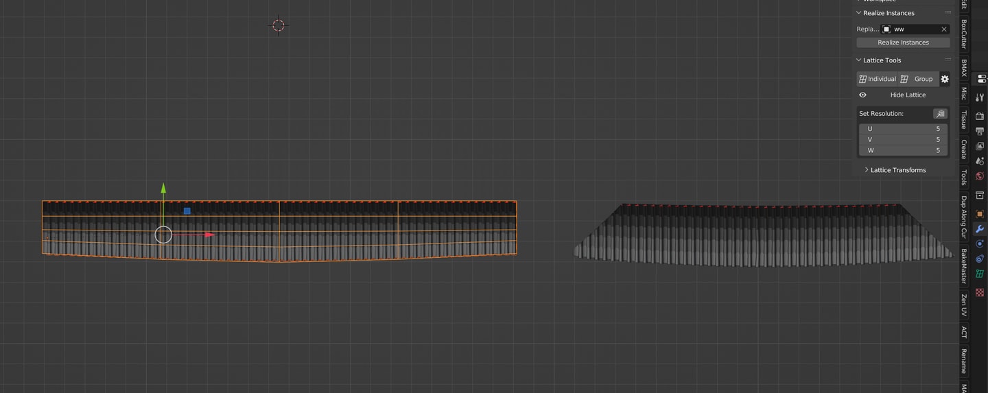 可以发现屋檐的弧度变化后原先绘制的椽子不贴和了,因此椽子得在屋檐弧度multilattice之后制作。curve deform在勾选fit curve的情况下无视原先物体的长度会自动适配曲线的长度因此无需担心物体的尺寸、旋转,不过得注意apply scale。由于屋檐筒瓦板瓦经过multilattice其中心位置向两侧是逐渐向上弯折向后收缩,因此椽子也需要通过multilattice调整,至此铺瓦和椽子贴合。