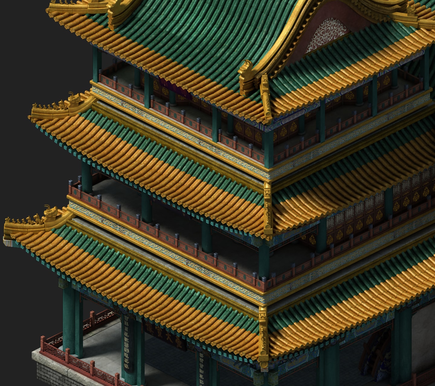 屋檐铺瓦先用一个梯形面把铺瓦的范围划分出来,梯形高度为瓦片铺盖的垂直投影长度,梯形上底边为两侧立柱的圆心,下底边为上底边沿着两侧45度斗拱平分线的相交处。