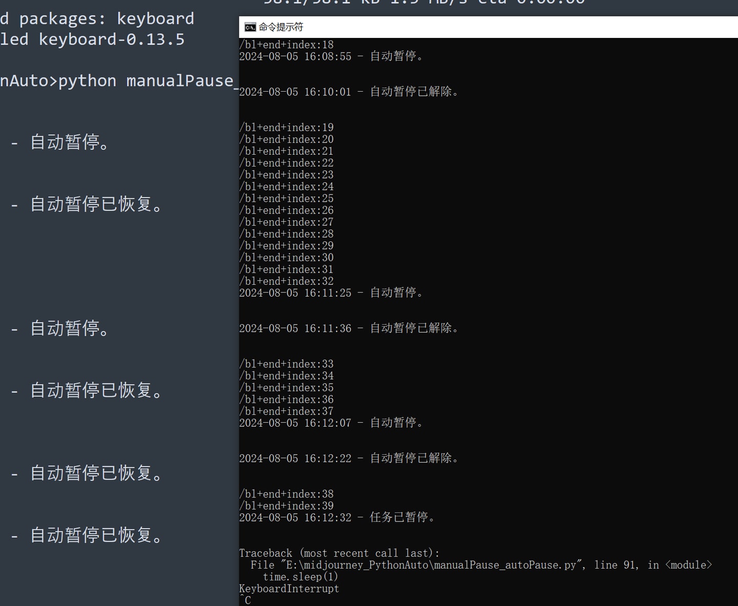 def toggle_pause(): global paused, pause_start_time, total_pause_time, auto_pause_start_time paused = not paused if paused: pause_start_time = time.time() auto_pause_start_time = None print(f"{get_current_time()} - 任务已暂停。\n\n") else: if pause_start_time is not None: total_pause_time += time.time() - pause_start_time pause_start_time = None print(f"{get_current_time()} - 任务已继续。\n\n")