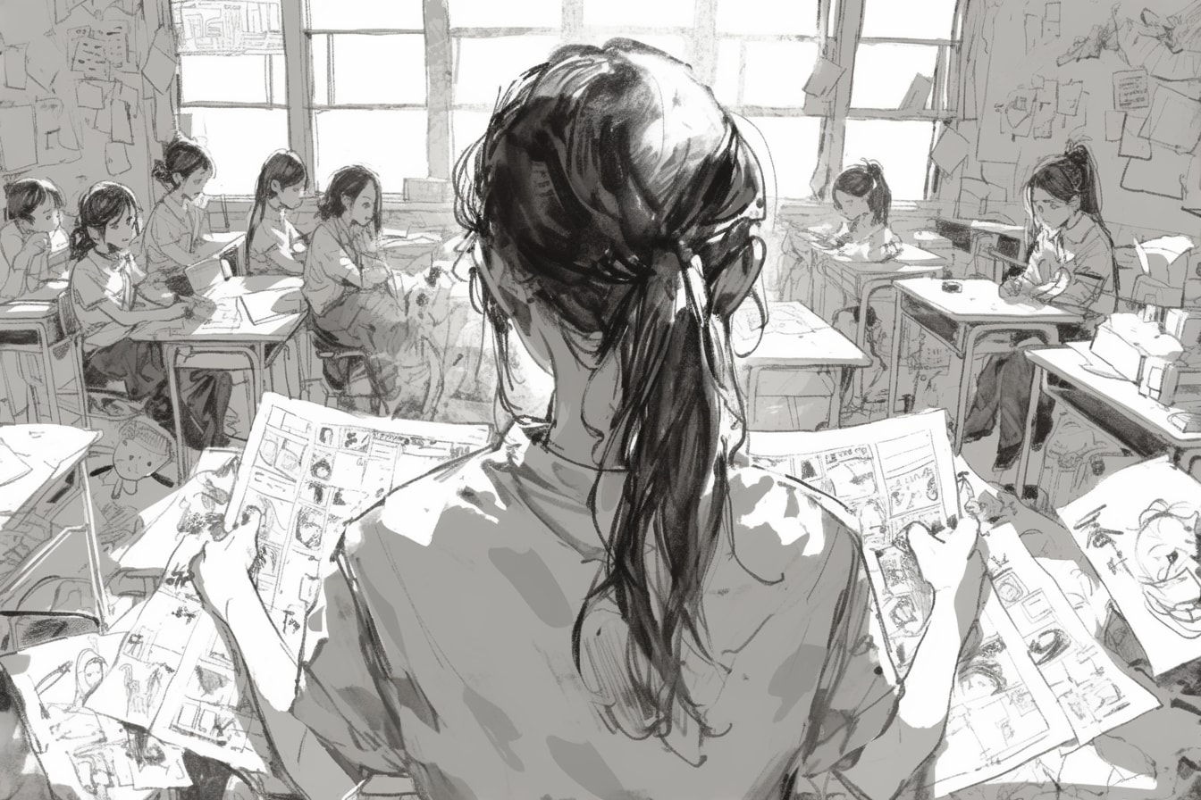 最终22张图出来以后,我觉得不算太满意,比较不错的是场景的协调一致性基本可以,但是人物画风还是偏差有些大,特别是对比度明暗方面。我想最好明暗是下面这种感觉。虽然可以通过大量参考图解决明暗问题,但是同时会因为人物pose造型重复而使人物在场景中的动作、布局僵化定型。