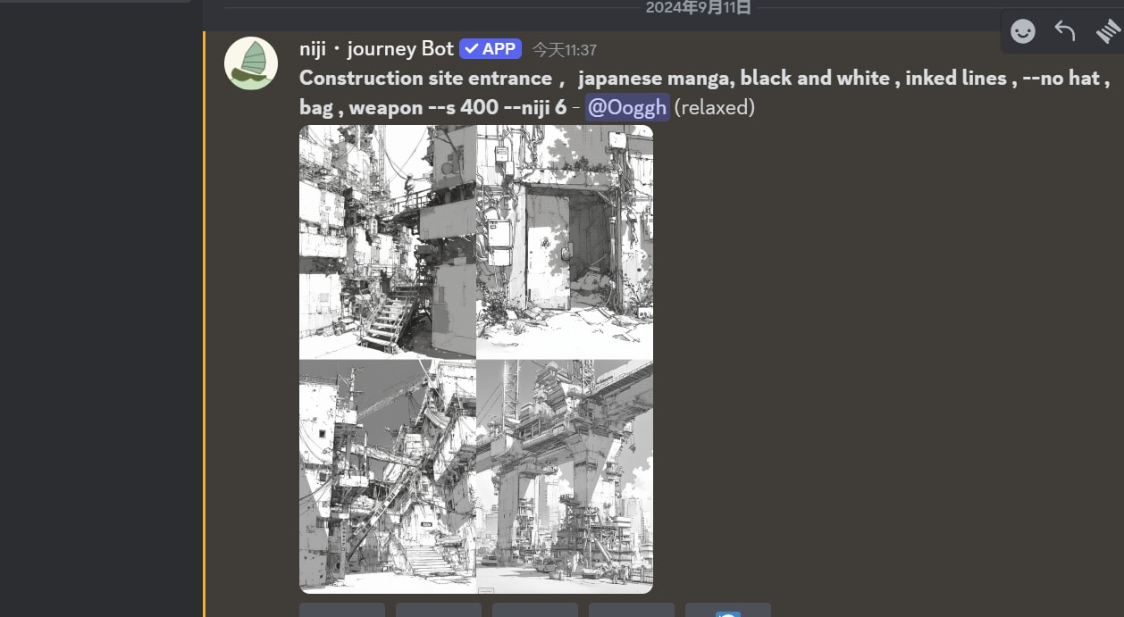 我先用客户端的mj生产器手动测试,可以看出来当只有location地点时,mj生产的图基本都是地点的全貌,这显然不是我需要的,只有室内空间比如会议室、寝室的图相对比较有特写风格。